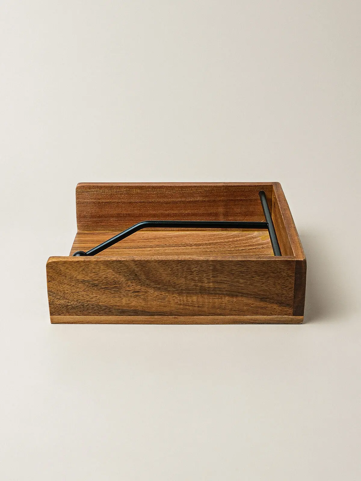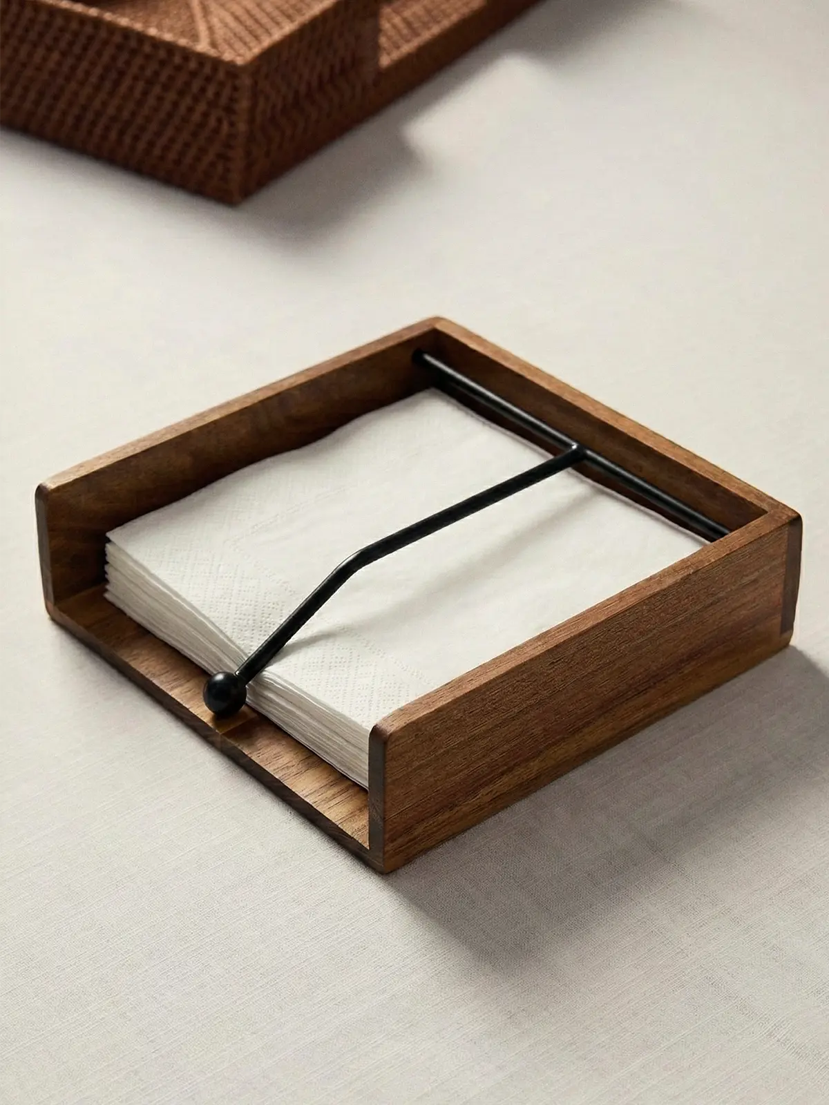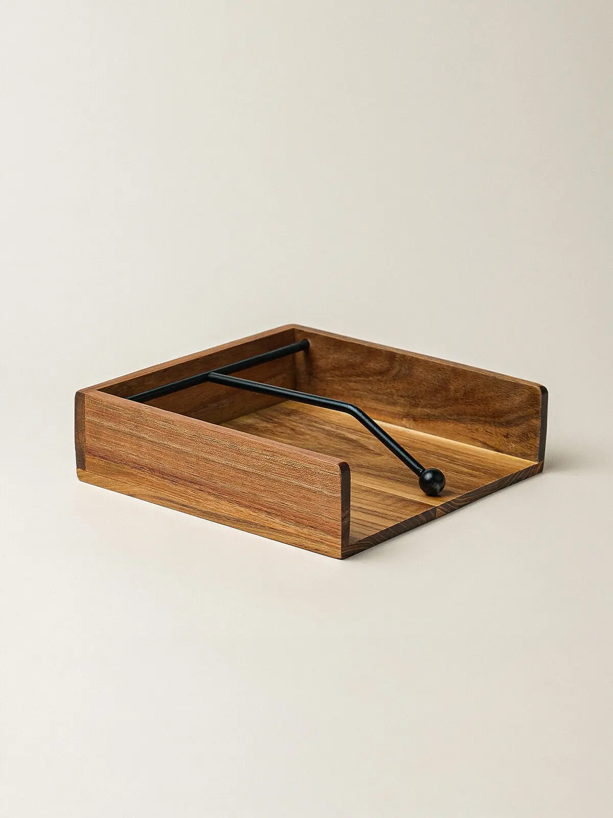 Alven Akasya Peçetelik, masif akasya ağacından üretilmiş olup kare formu ve metal sabitleyici kol detayıyla peçeteleri düzenli ve sabit şekilde tutar. 5 cm yüksekliği ile kompakt bir duruş sunarken, 18,5 cm genişlik ve 18,5 cm derinliği sayesinde standart peçetelerle uyumludur. Doğal ahşap dokusu ve sade tasarımıyla günlük kullanımda ve sofralarda zamansız bir şıklık sağlar.