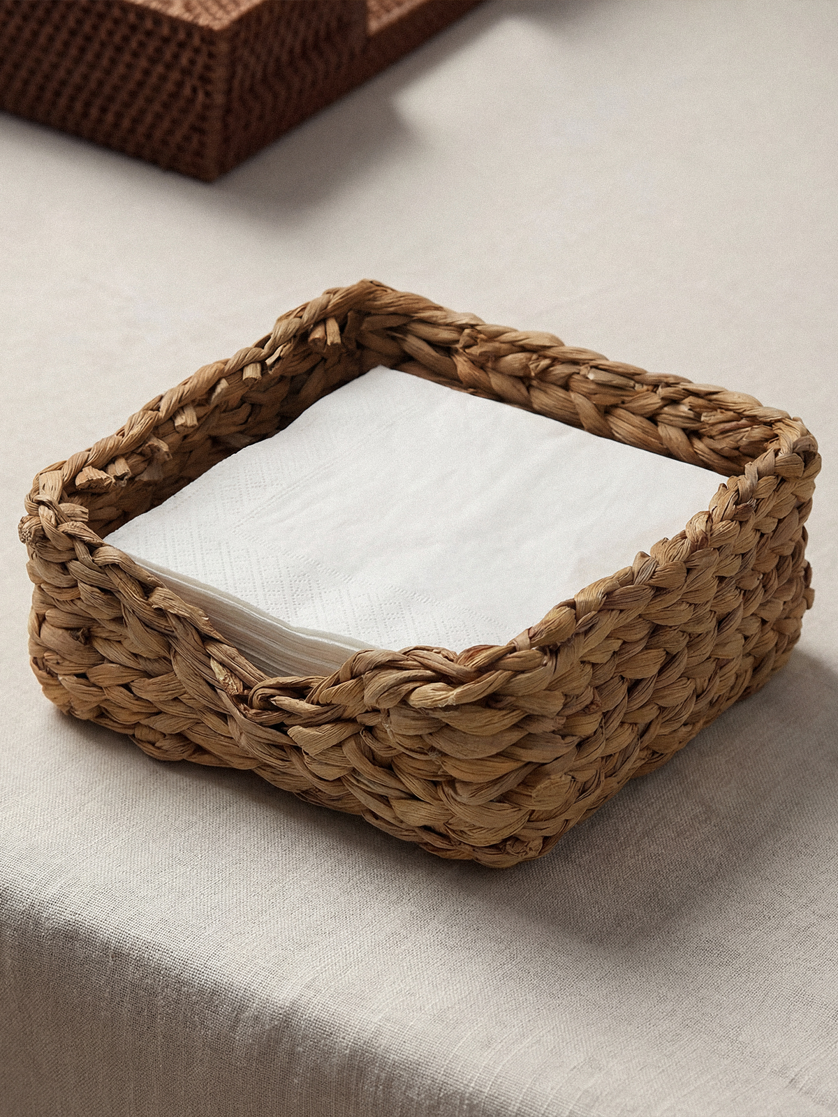 Doğal su sümbülü liflerinden elde edilen Elsa Peçetelik, sade ve sıcak dokusuyla sofralara zarif bir düzen katar. El örgüsü görünümüyle hem dekoratif hem kullanışlıdır. 19 cm ölçüsü, standart peçeteler için ideal boyuttadır ve masada minimal, şık bir duruş sağlar.
