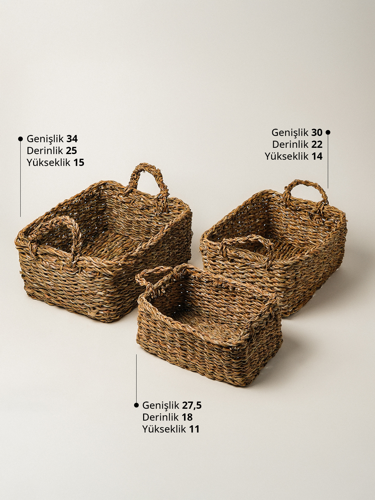 Büyük: 34 × 25 × 15 cm • Orta: 30 × 22 × 14 cm • Küçük: 27,5 × 18 × 11 cm ölçüleriyle iç içe geçebilen pratik ve dekoratif bir settir.